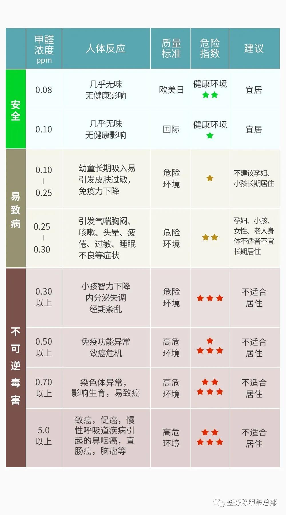 我們國家規定的甲醛標準限值是0.1㎎/m3,室內甲醛超標對人體的危害不可小覷。甲醛是一種無色有刺激性氣味的氣體,對于普通人來說,只有當甲醛的濃度超標3倍以上才可能聞到味道,這一點也是許多受害者受到甲醛危害的原因,認為聞不到味了就是沒甲醛了。(溫度為0℃時,1PPM=0.74666 mg/m3)