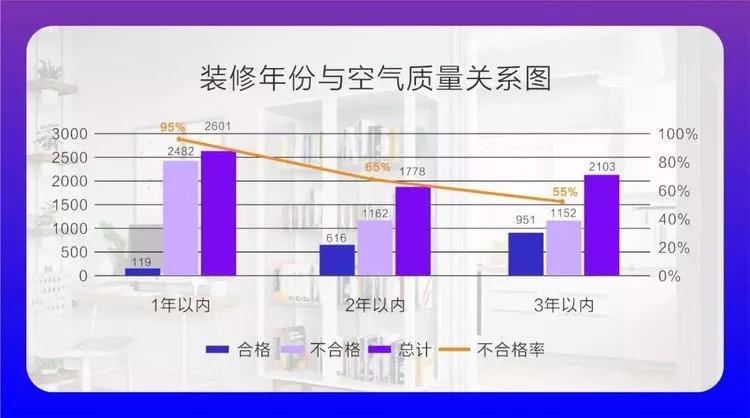 室內空氣污染程度隨著裝修完成年份的增長而降低,其中裝修1年內房屋不合格率為95%,裝修2年內不合格率為65%,裝修3年內不合格率為55%。
